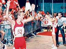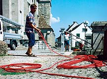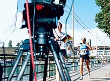 Oberhalb der Schlosstreppe, unter einem schattigen Mauervorsprung, warten die tpc-Monteure. Zu ihren Füssen schlängelt sich meterweise oranges Kabel. Fachmännisch geschichtet, zum sofortigen Abrollen bereit. Noch wirken die Gassen der Altstadt wie ausgestorben. Aber die Sonne brennt bereits gnadenlos vom strahlend blauen Himmel. Der wievielte Hitzetag in Serie, der wievielte im heurigen Jahrhundertsommer dieser Dienstag anfangs August wohl ist? Den Monteuren bleibt keine Zeit, solchen Fragen nachzuhängen. Vom Kirchturm schlägts halb zwei Uhr, als der Van mit der tpc-Kameracrew vor den Wartenden stoppt. Heraus springen die Profis, die Kameras bereits geschultert. Ab sofort zählt jede Minute! Ein paar Gassen weiter hat sich nämlich soeben der letzte Athlet in Quarantäne begeben. Kurz darauf werden endlich die einzelnen Kamerastandorte offiziell bekannt. Als streng geheim galten sie bis jetzt, damit keiner aufgrund ihrer Platzierung auf die Lage eines OL-Postens schliessen konnte. Einzig das Organisationskomitee (OK) und die Fernsehleute kannten die Standorte schon Monate im Voraus. Schliesslich waren sie bei der Planung einzubeziehen, kann doch für diese Übertragung niemand auf einen Erfahrungswert zurückgreifen. Die bevorstehende OL-Livesendung wird also weltweit Premiere haben. «Uns steht», erinnerte SF DRS-Produzentin Karin Nussbaumer zuvor an der Regiebesprechung die Verantwortlichen, «eine anspruchsvolle, eine schwierige Produktion bevor». Die Erwartungen an das Fernsehteam sind in den letzten Wochen täglich gestiegen. Wurde der Orientierungslauf früher von den Medien noch stiefmütterlich behandelt, stiess die erst zum zweiten Male in der Schweiz ausgetragene OLWM schon im Vorfeld auf unerwartet viel Echo. So drehen nebst SF DRS auch private TV-Regionalsender vor Ort. Und zusätzlich zu den skandinavischen Fernsehstationen, die nach dem Rennen vom tpc Aufzeichnungen beziehen, hat auch die Eurovision 15 Minuten Highlights bestellt. Die Fernsehmacher konzentrieren sich aber vor allem auf die Livesendung. Sie soll reibungslos übertragen werden und mitunter den OL-Sport in der Schweiz populärer machen. Dafür hat das tpc in der Vorwoche zwei Kilometer Glasfaserkabel gelegt von der Eishalle im Lido bis zum Fischmarkt in der Altstadt. Hier steht mittlerweile auch der Reportagewagen M, der die Signale aller fünf Altstadtkameras aufnimmt und an den XL unten bei der Eishalle weiterleitet. Dreieinhalb Kilometer Kamerakabel ziehen sich wie ein roter Faden quer durch die Altstadt: mit dem Skyworker an Fassaden gehängt, entlang der Häuserzeilen am Boden gelegt oder über Schaufensterpassagen geführt. tpc data hat für den OL am Bildschirm sogar eine eigene Software entwickelt. So betreut Rolf Burri, Leiter data, zusammen mit seinem Team alle Einblender für die Live- Kiste und die Zusammenschnitte. Die Daten werden von einer speziellen Datenbank abgerufen, grafisch aufbereitet und entsprechend dargestellt. Zur Verfügung steht eine Fülle von Läuferinfos wie Name, Zeit, aktueller Rang oder Nationalität, aber auch topaktuelle Ranglisten. Regiewünsche können innert Sekundenfrist berücksichtigt und umgesetzt werden. Das data-Team sitzt im Car der italienischen Zeitmessungsfirma und empfängt hier die Anweisungen. Oben in der Altstadt: Die tpc-Mitarbeiter schnappen sich die Kabelenden und eilen zu Fuss, die Kabel hinter sich herziehend, zu den nahe gelegenen Kamerastandorten. Alberto Morand, verantwortlich für die Startkamera, trifft fast gleichzeitig mit einem Dutzend Rekruten am vorgesehenen Start ein. Das Militär zimmert in Windeseile eine hölzerne Startrampe und spannt den Auslöser für die Zeitmessung. Hundert Meter die Gasse hinauf richtet sich Kameramann Oliver Wills ein. Er bedient die zweite Altstadt-Kamera und wird später in der gleissenden Sonne auf einem kleinen Gerüst stehen. Geschützt durch einen alten Sonnenschirm, den er sich von einer grosszügigen Rapperswilerin ausgeliehen hat. Von hier nimmt er die Läuferinnen ab Start ins Visier, verfolgt sie zum ersten OLPosten, bevor sie leichtfüssig um die nächste Ecke verschwinden. Bei der Schlosstreppe geblieben ist Guy Perrenoud, der den Auftrag hat, die Athleten auf dem Hauptplatz und auf der mit Blumen bepflanzten Treppe zu filmen. Von ihm erwartet die Regie wirkungsvolle Stimmungsbilder. Noch zwei weitere Kameras werden in der Stadt aufgestellt: Die eine auf der Terrasse der «Touristinfo», gleich neben dem OK-Kommentatorenpult. Die andere ein Stück weiter auf dem Seedamm, da wo die Zwischenzeit genommen wird. Am Uferweg beim Minigolf ist die sechste platziert, Nummer Sieben bewacht den Eingang zur Eishalle. Drinnen verfolgen zwei Kameras den Zieleinlauf, eine weitere fängt Emotionen ein und begleitet SF DRS-Moderator Mario Denzler zu Interviews. Macht total zehn Kameras. Insgesamt fünfzig tpc- Leute wurden für den heutigen Tag aufgeboten: Kameraleute, Tontechniker, Monteure etc. Beat Zumstein, als tpc-Projektleiter verantwortlich für die gesamte WMProduktion, ist bereits gestern angereist. Gleichentags eingetroffen ist auch der grosse Reportagewagen XL, der heute Morgen noch von zwei kleineren, den Ms, inklusive Materialwagen Gesellschaft erhalten hat. Zwischen zwei und drei Uhr nachmittags machen sich die Testläufer für die Kamera- und Grafikproben bereit. Unter ihnen Matthias Gilgien, der für die WM knapp nicht selektioniert wurde und zumindest bis gestern als erster Ersatz noch auf einen Startplatz hoffen durfte. Auch wenn jetzt daraus nichts geworden ist, freut er sich auf das Stadtrennen: «Ich hab mich schliesslich zwei Jahre lang auf diese WM vorbereitet». Wer heute wohl gewinnt? Matthias Gilgien überlegt nicht lange: Simone Luder oder Marie-Luce Romanens bei den Frauen, Yuri Omeltchenko der Mann mit der Glatze bei den Männern. Die Altstadt füllt sich langsam mit Publikum: Gruppen junger OL-Fans aus dem Inund Ausland schlendern durch die Gassen. Die Frauen im Bikini, die Männer 