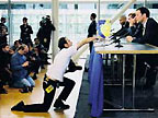 Ein kalter Wind bläst durch die Strassen von Basel. Eine dunkle Limousine bremst abrupt vor der Messehalle 1. Der italienische Star-Schiedsrichter Pierluigi Collina entsteigt dem Wagen, streicht sich mit der rechten Hand über das kahle Haupt und schlägt die Autotür zu. Der Wagen braust davon. Das Autogramm des charismatischen Referees ist an diesem Nachmittag das einzig wirklich Prominente auf den Schreibblöcken der in der Kälte ausharrenden Fussballfans. Zidane und Co. werden über die Tiefgarage ins Gebäude geschleust. Im ersten Stock der Halle 1 läuft zu dieser Zeit bereits die Pressekonferenz. Knapp 200 Journalisten aus der ganzen Welt löchern die drei Nominierten für den Weltfussballer mit ihren Fragen. «Monsieur Henry, Sie sind der einzige der drei Nominierten, der im Anzug zur Pressekonferenz erschienen ist. Haben Sie eine Vorahnung, dass Sie gewinnen?! » Ronaldo kichert, Zidane hüstelt belustigt in seine gefalteten Hände. Fotoapparate klicken. Blitze schiessen durch den grossen Raum. Wenig später ist der Spuk vorbei. Die Stars verlassen die Pressekonferenz durch einen Hinterausgang. Im benachbarten Presseraum starten die ersten Medienschaffenden an den 110 Arbeitsplätzen ihre Laptops. Redaktor Mani Hildebrand kommt derweil ins Schwitzen. Kurz zuvor ist er aus London zurückgekehrt, um dem Management von «Atomic Kitten» gleichen Morgens noch das Showkonzept und die Dekorpläne zu präsentieren. Vergebens. Der Privatjet streikte und die Gruppe wäre erst eine halbe Stunde vor Sendebeginn in Basel angekommen. Zu spät, um noch seriös zu proben. Schweren Herzens musste Hildebrand den Chartstürmerinnen eine Absage erteilen: «Solche Momente sind frustrierend. Da hat man knapp dreiviertel Jahr auf diesen Auftritt hingearbeitet und innert Sekunden muss man seine eigenen Vorbereitungen zunichte machen. Auch wenn das Showbusiness unberechenbar ist, kommen solche Momente zum Glück äusserst selten vor.» Mani Hildebrand ist sich in seiner Funktion den Umgang mit Stars und Sternchen gewohnt: «Das ist Teil meiner Tätigkeit. Doch Begegnungen mit Promis sind auch für mich noch spannend. Aber ich würde niemals vor einem Star in Ehrfurcht erstarren.» Ein Lachen huscht über sein Gesicht. «Ich probiere, allen Künstlern den Aufenthalt so angenehm wie möglich zu machen. Sie sollen spüren, dass man sich um sie kümmert.» So sind hinter der Bühne zwei kleine Partyzelte aufgebaut, in denen sich die Künstler auf den Ledersofas verweilen und auf ihren Auftritt vorbereiten können. Neben der Verpflichtung der Showblöcke für die Sendung sowie der Organisation für deren Unterkunft und Transport stand der Redaktor auch den Moderatoren mit Informationen zu den Gästen zur Seite. Innert weniger Tage wurde die riesengrosse Messehalle zu einem Fernsehstudio mit integriertem VIP-Bereich und Parkplatz für den Reportagewagen L1 vom tpc umfunktioniert. Rund 1200 Quadratmeter Stoff trennen das improvisierte Studio von der übrigen Halle, meterweise blauer Teppich geleiten die Gäste zu ihren Sitzplätzen. Acht Sattelschlepper transportierten die Showbühne, Projektionswände, die 566 Zuschauern Platz bietende Tribüne, das Podest für Medienschaffende und Techniker, den Kameraboden, Sichtschutz für den Backstagebereich, die Maskenplätze und die VIP-Zelte nach Basel. «Die Dekorplanung für diesen Anlass nahm alles in allem etwa drei Tage in Anspruch», schätzt Bühnenmeister Patrick Dall’Oglio. An der sechstägigen Vorbereitungs- und Aufbauphase des Dekors waren immer zwischen sieben und zwölf Bühnenhandwerker beteiligt. Der Restaufbau der Hallendekoration beanspruchte nochmals drei Personen während vier Tagen. Regisseur Paul Fischer bespricht mit dem Produktionsteam die letzten Details. Da wird ein Scheinwerfer zurechtgerückt, dort eine Kameraeinstellung geprobt. Zusammen mit einigen Mitarbeitenden – darunter Redaktor Mani Hildebrand und Moderator Matthias Hüppi – bestreitet Paul Fischer in diesen Tagen ein Mammut- Sportprogramm. Kaum 48 Stunden zuvor brachten sie die Verleihung der Schweizer Sport-Awards über die Bühne und auf den Sender – nun produzieren sie gemeinsam die FIFA World Player Gala. Trotz einer gewissen Routine geniesse er die Begegnungen mit so genannten Stars immer wieder von neuem, meint der Regisseur. «Auch wenn man nur bis auf einen Meter an sie herankommt, kribbelt’s bei mir immer noch.» Allerdings sei er nicht besonders nervös, was die Sendung betrifft – selbst wenn die von ihm ausgewählten Bilder in Kürze in Millionen von Wohnstuben zu sehen sein werden. «Man muss jeden Job gut machen – unabhängig von Auftraggeber und Auftragsvolumen. Es ist jedoch ein besonderes Erlebnis für alle involvierten tpc-Mitarbeitenden, eine solche weltweit ausgestrahlte Sendung zu realisieren.» Bei Vanessa Müller, einer von vier Aufnahmeleiterinnen, eilt’s. Sie muss innert kürzester Zeit die Laudatoren und Nominierten auf die Sendung vorbereiten, sie zur Maske und zum Tonoperateur begleiten, wo sie mit Mikrofonen ausgestattet werden. «Bisher kannte ich Zidane, Ronaldo und die anderen Fussballgrössen nur aus dem Fernsehen», sagt Vanessa Müller. «Plötzlich stehen diese Stars gut angezogen mit Anzug und Krawatte da und hören auf meine Anweisungen. Keine Frage, da schlägt einem das Herz viel schneller.» Punkt 15 Uhr geht’s los: Die Moderatoren Matthias Hüppi und Amanda McLane betreten die Bühne. Egal, ob in den Favelas von Brasilien, in den Pubs von Grossbritannien oder in japanischen Wohnstuben; überall wird an diesem späten Nachmittag die von Host-Broadcaster tpc produzierte Gala-Sendung verfolgt. «Die Rechte wurden in 142 Länder verkauft», so Hans Peter Traub, der als Produktionsleiter für die gesamte Planung verantwortlich zeichnete. Die Fans des schottischen Klubs FC Dundee United nehmen den Fairness-Preis entgegen. Birgit Prinz wird als beste Fussballerin ausgezeichnet. Und Zidanes Wahl zum «Weltfussballer des Jahres» b